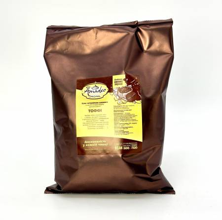 Відбірні сорти смаженої кави в зернах, вдало поєднано з ароматом одного з найвідоміших десертів Європи - тоффі. Має шоколадно-молочний відтінок аромату і міцний насичений смак з помітною гірчинкою і високою щільністю.